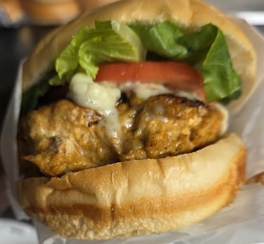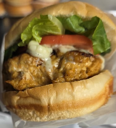 #5. Barnyard Brother - (Burger Brothers Special) 8oz. Chicken Burger pre mixed and topped with Gorgonzola and a Mild Buffalo Sauce.